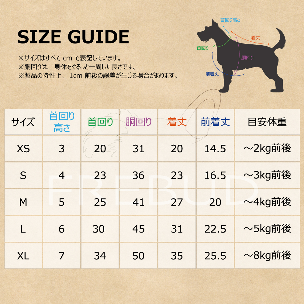 | サイズ | 首回り高さ | 首周り | 胴周り | 着丈 | 前着丈 | 目安体重 |